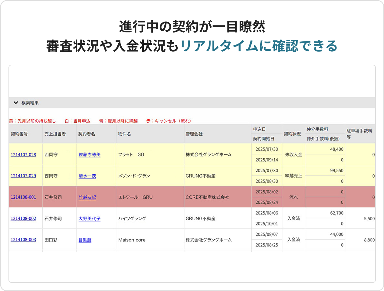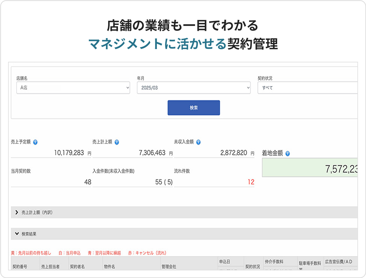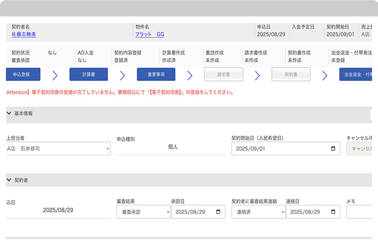 契約に関する業務をすべてシステム化。店舗内の契約状況や進捗を管理できます。申込